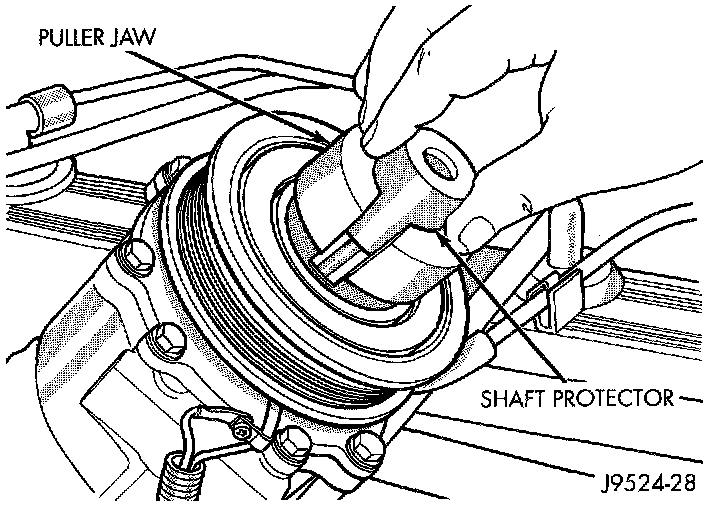 11. Install the puller through-bolts (Special Tool C-6461) through the puller flange and into the jaws of the rotor puller and tighten. Turn the puller center bolt clockwise until the rotor pulley is free.