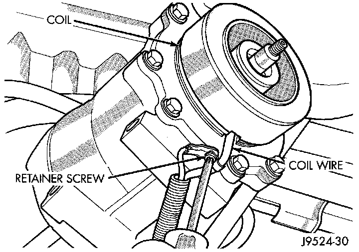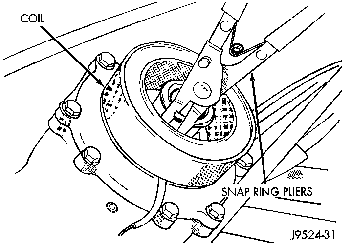 13. Remove the snap ring from the compressor hub and remove the clutch field coil. Slide the clutch field coil off of the compressor hub.