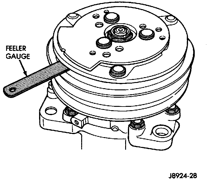 NOTE: The air gap is determined by the spacer shims. When installing an original, or a new clutch assembly, try the original shims first. When installing a new clutch onto a compressor that previously did not have a clutch, use 1.0, 0.50, and 0.13 millimeter (0.040, 0.020, and 0.005 inch) shims from the clutch hardware package that is provided with the new clutch.