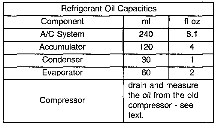 Refrigerant oil must be added when a accumulator, evaporator coil, or condenser are replaced. See the Refrigerant Oil Capacities chart. When a compressor is replaced, the refrigerant oil must be drained from the old compressor and measured. Drain all of the refrigerant oil from the new compressor, then fill the new compressor with the same amount of refrigerant oil that was drained out of the old compressor.