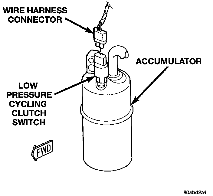2. Unplug the wire harness connector from the low pressure cycling clutch switch on the top of the accumulator.