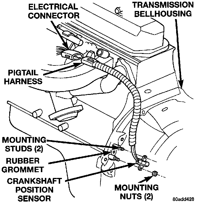The Crankshaft Position Sensor is mounted to the transmission bellhousing at the left/rear side of engine block.