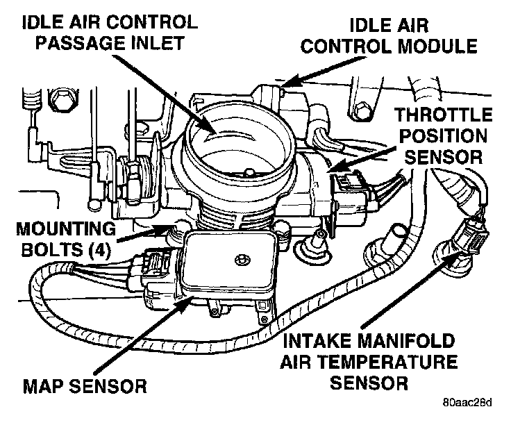 The Throttle Position Sensor (TPS), IAC motor and Manifold Absolute Pressure sensor (MAP) are attached to the throttle body. The accelerator pedal cable, speed control cable (when equipped) and automatic transmission control cable (when equipped) are connected to the throttle arm.