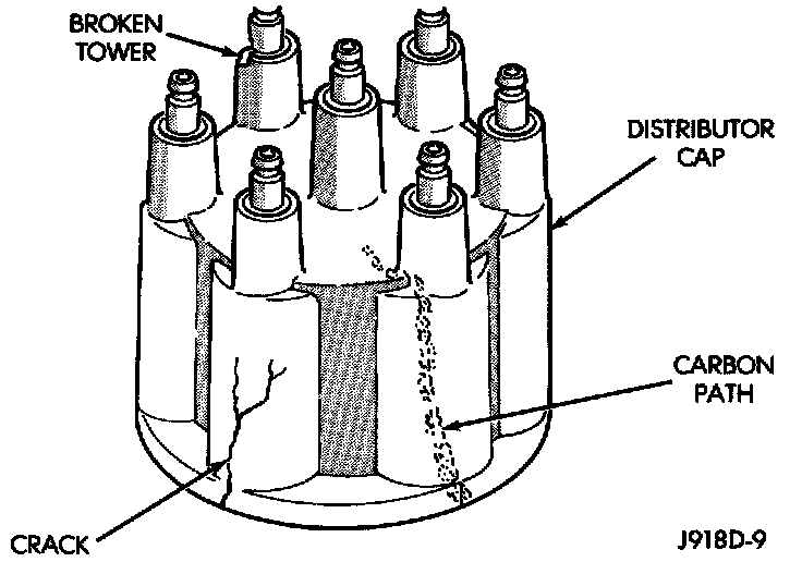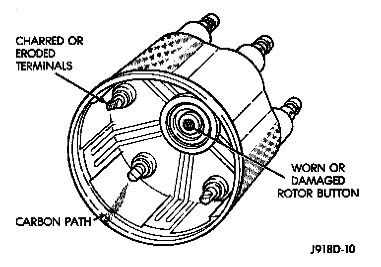 Remove the distributor cap and wipe it clean with a dry lint free cloth. Visually inspect the cap for cracks, carbon paths, broken towers or damaged rotor button. Also check for white deposits on the inside (caused by condensation entering the cap through cracks). Replace any cap that displays charred or eroded terminals. The machined surface of a terminal end (faces toward rotor) will indicate some evidence of erosion from normal operation. Examine the terminal ends for evidence of mechanical interference with the rotor tip.