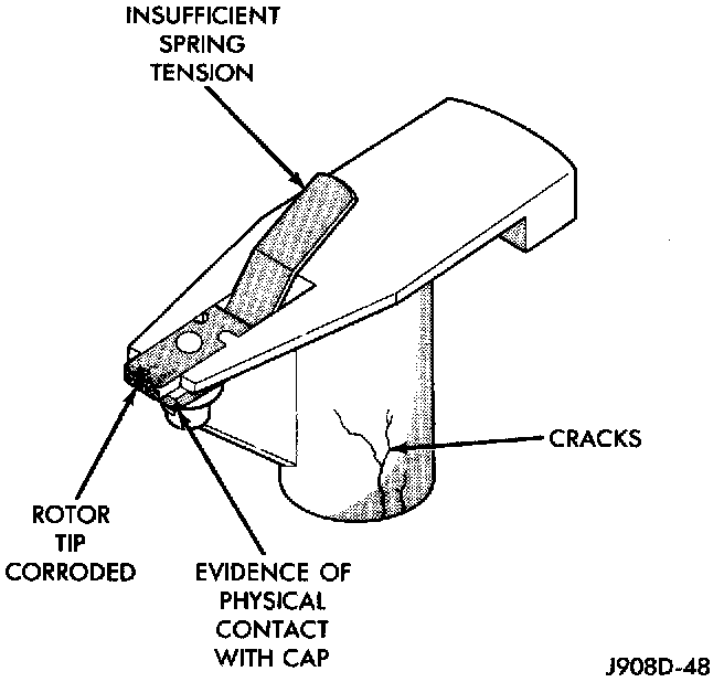 Visually inspect the rotor for cracks, evidence of corrosion or the effects of arcing on the metal tip. Also check for evidence of mechanical interference with the cap. Some charring is normal on the end of the metal tip. The silicone-dielectric varnish-compound applied to the rotor tip for radio interference noise suppression, will appear charred. This is normal. Do not remove the charred compound. Test the spring for insufficient tension. Replace a rotor that displays any of these adverse conditions.