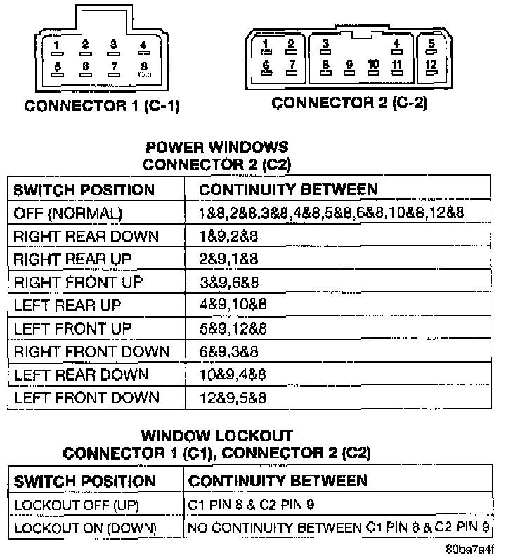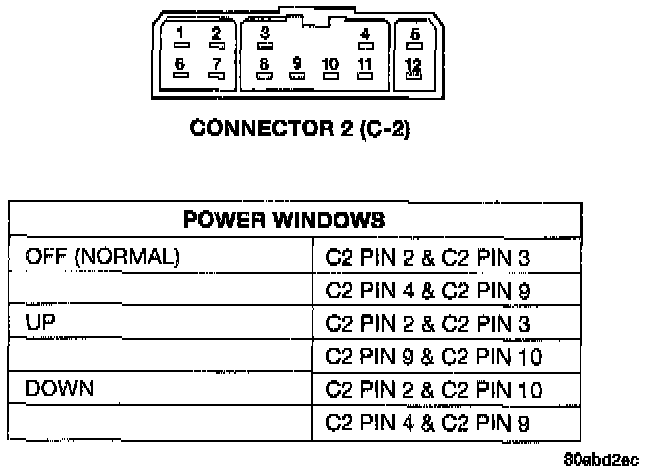 2. Check the door module power window switch and/or power window lockout switch continuity in each position, as shown in the proper chart. If OK, see the Power Window Motor diagnosis. If not OK, replace the faulty door module.
