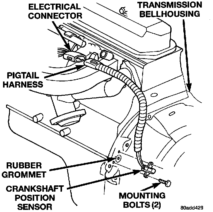 The Crankshaft Position Sensor is mounted to the transmission bellhousing at the left/rear side of engine block.