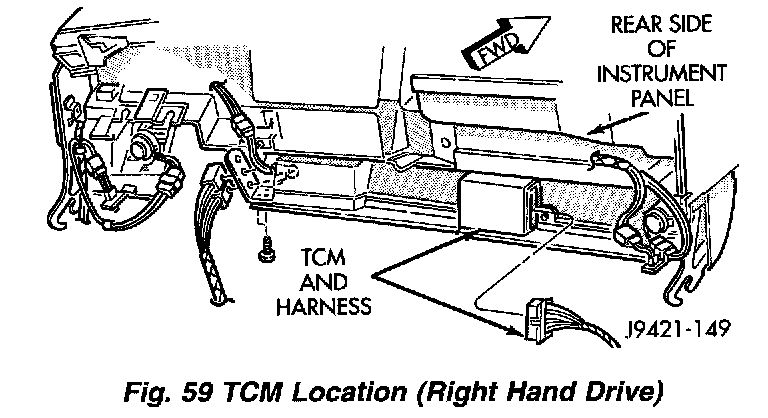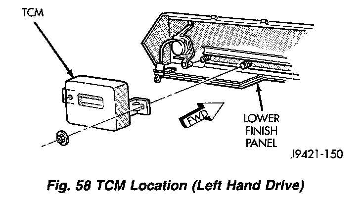 The transmission control module is mounted under the instrument panel. On left hand drive models, it is at the driver side of the lower finish panel. On right hand drive models, it is at the passenger side of the lower finish panel.