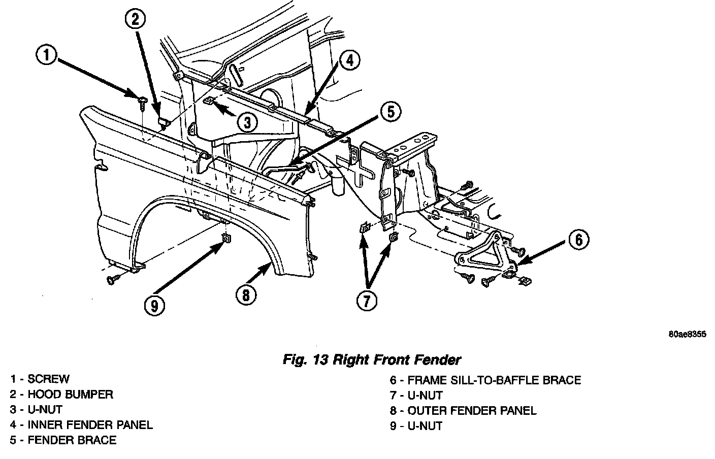 3. If equipped, remove the radio antenna mast, and components from the fender.