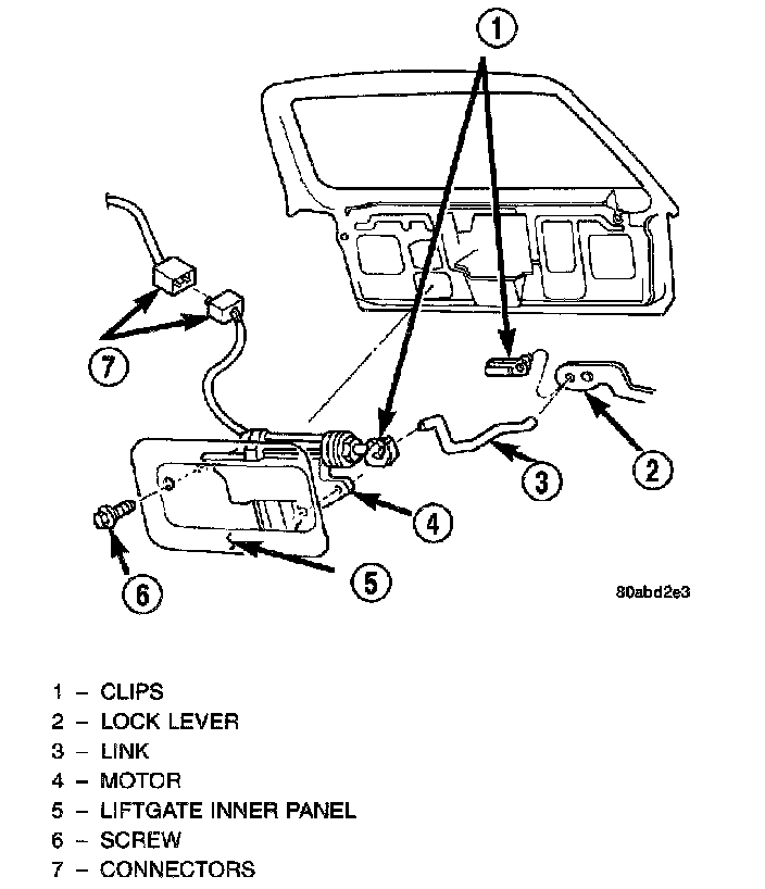 4. Reach through the liftgate inner panel access hole and disconnect the link from the clip on the power lock motor.