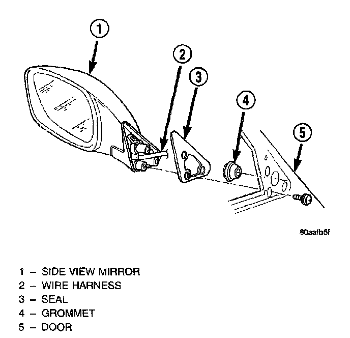 15. Pull the mirror and seal from the outside of the door while feeding the wire harness, grommet, and connector out through the hole from the inside of the door.