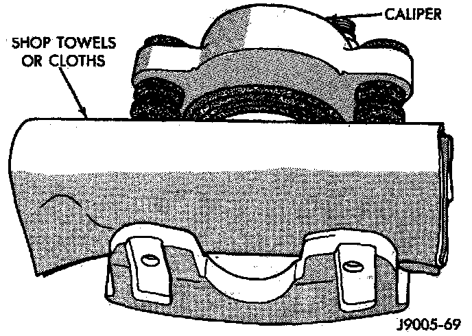 3. Take a piece of wood and pad it with one-inch thickness of shop towels. Place this piece in the outboard shoe side of the caliper in front of the piston.