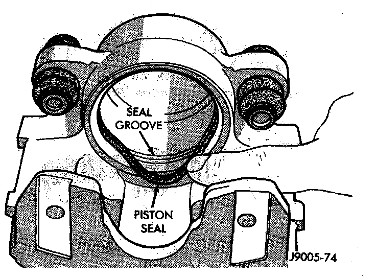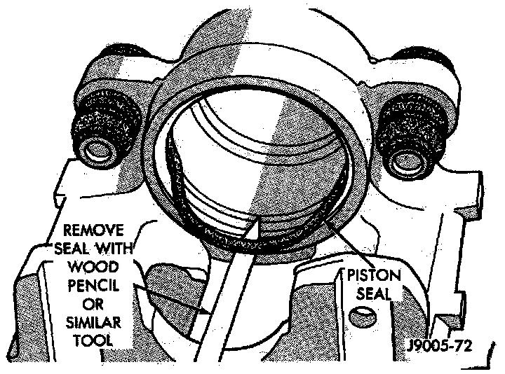 6. Remove caliper piston seal with wood or plastic tool. Do not use metal tools as they will scratch piston bore.