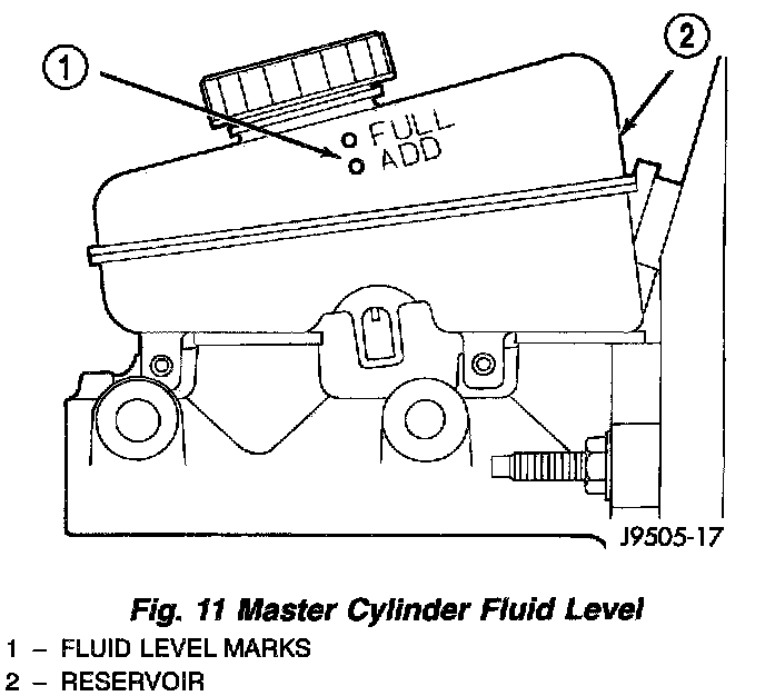 Always clean the master cylinder reservoir and cap before adding fluid. This will prevent dirt from falling in the reservoir and contaminating the brake fluid.The reservoir has an ADD and a FULL mark on the side fill to the FULL mark.