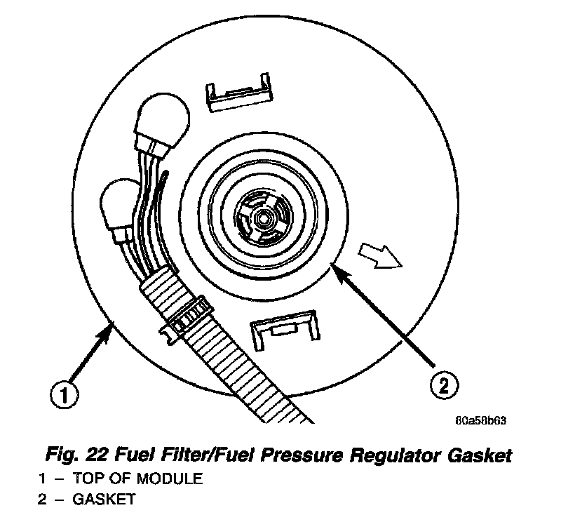 6. The arrow (Fig. 21) molded into top of fuel pump module should be pointed towards front of vehicle (12 o'clock position).