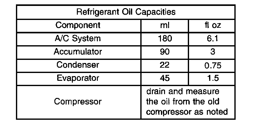 Refrigerant oil must be added when a accumulator, evaporator coil, or condenser are replaced. See the Refrigerant Oil Capacities chart. When a compressor is replaced, the refrigerant oil must be drained from the old compressor and measured. Drain all of the refrigerant oil from the new compressor, then fill the new compressor with the same amount of refrigerant oil that was drained out of the old compressor.