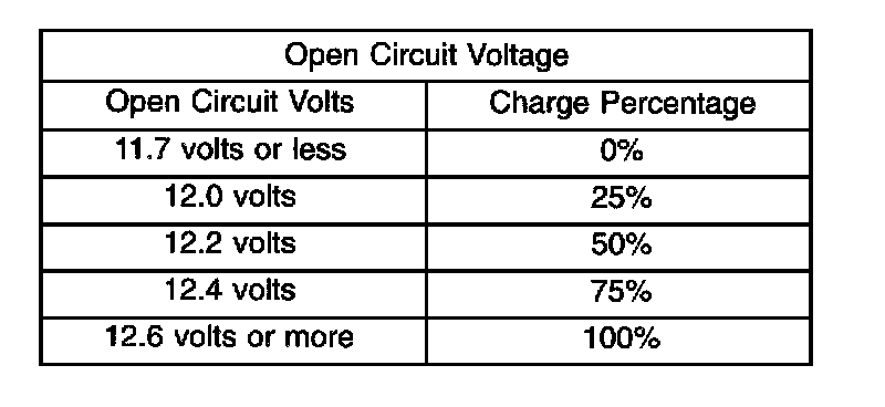 See the Open-Circuit Voltage chart. This voltage reading will indicate the battery state-of-charge, but will not reveal its cranking capacity. If a battery has an open-circuit voltage reading of 12.4 volts or greater, it may be load tested to reveal its cranking capacity. Refer to Load Test for the proper battery load testing procedures.