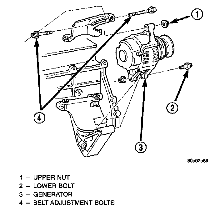 4. Right Hand Drive (RHD) Vehicles Only:Remove upper nut (generator adjustment nut) and both belt adjustment bolts. Remove generator lower nut/bolt. Position generator for access to wire connectors.
