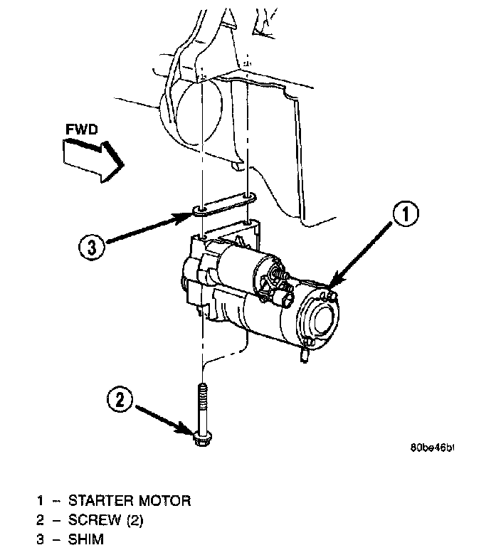 5. Position the starter motor and any starter motor shims that were removed during the starter motor removal procedure to the engine block. Loosely install the two starter motor mounting screws to secure the starter motor and slums to the engine block.