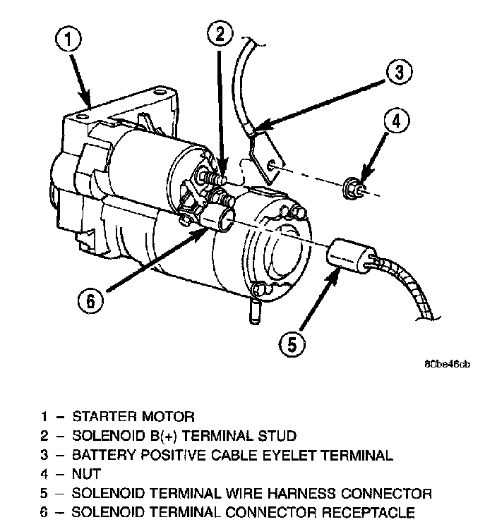 5. Remove the battery positive cable eyelet terminal from the starter solenoid B(+) terminal stud. Always support the starter motor during this process. Do not let the starter motor hang from the wire harness.
