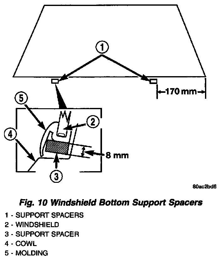 11. Apply a small amount of adhesive to the bottom support spacers and attach the support spacers to the bottom of the windshield, 170 mm inboard from the outer windshield edge (Fig. 10).