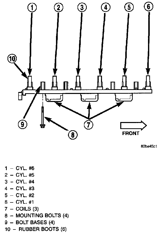 A one-piece coil rail assembly containing three individual coils is used on this engine. The coil rail must be replaced as one assembly. The bottom of the coil is equipped with 6 individual rubber boots to seal the 6 spark plugs to the coil. Inside each rubber boot is a spring. The spring - is used for an electrical contact between the coil and the top of the spark plug. These rubber boots and springs are a permanent part of the coil and are not serviced separately.