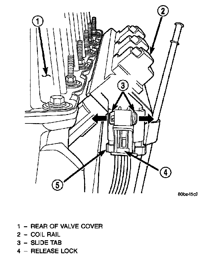 4. After coil has cleared spark plugs, position coil for access to primary electrical connector. Disconnect connector from coil by pushing slide tab outwards to right side of vehicle. After slide tab has been positioned outwards, push in on secondary release lock on side of connector and pull connector from coil.