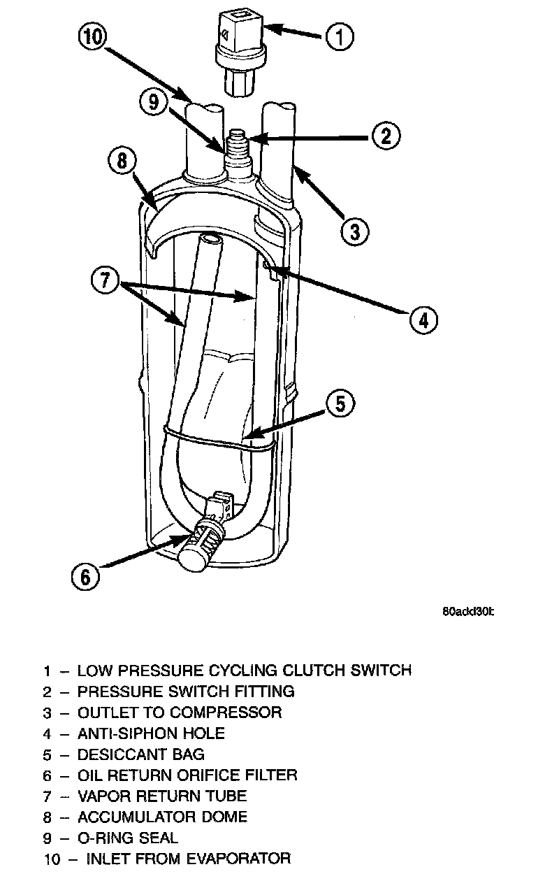 Refrigerant enters the accumulator canister as a low pressure vapor through the inlet tube. Any liquid, oil-laden refrigerant falls to the bottom of the canister, which acts as a separator. A desiccant bag is mounted inside the accumulator canister to absorb any moisture which may have entered and become trapped within the refrigerant system.