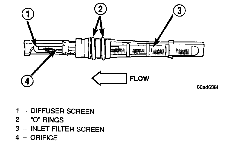 The inlet end of the fixed orifice tube has a nylon mesh filter screen, which filters the refrigerant and helps to reduce the potential for blockage of the metering orifice by refrigerant system contaminants. The outlet end of the tube has a nylon mesh diffuser screen. The O-rings on the plastic body of the fixed orifice tube seal the tube to the inside of the liquid line and prevent the refrigerant from bypassing the fixed metering orifice.