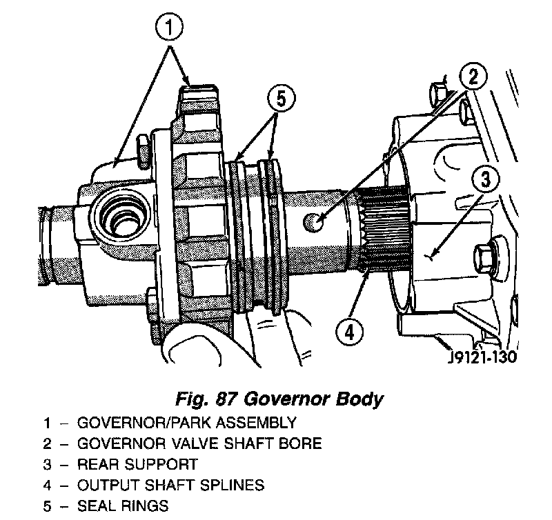11. Remove snap rings and spacer that retain governor body and park gear assembly on output shaft (Fig. 86).