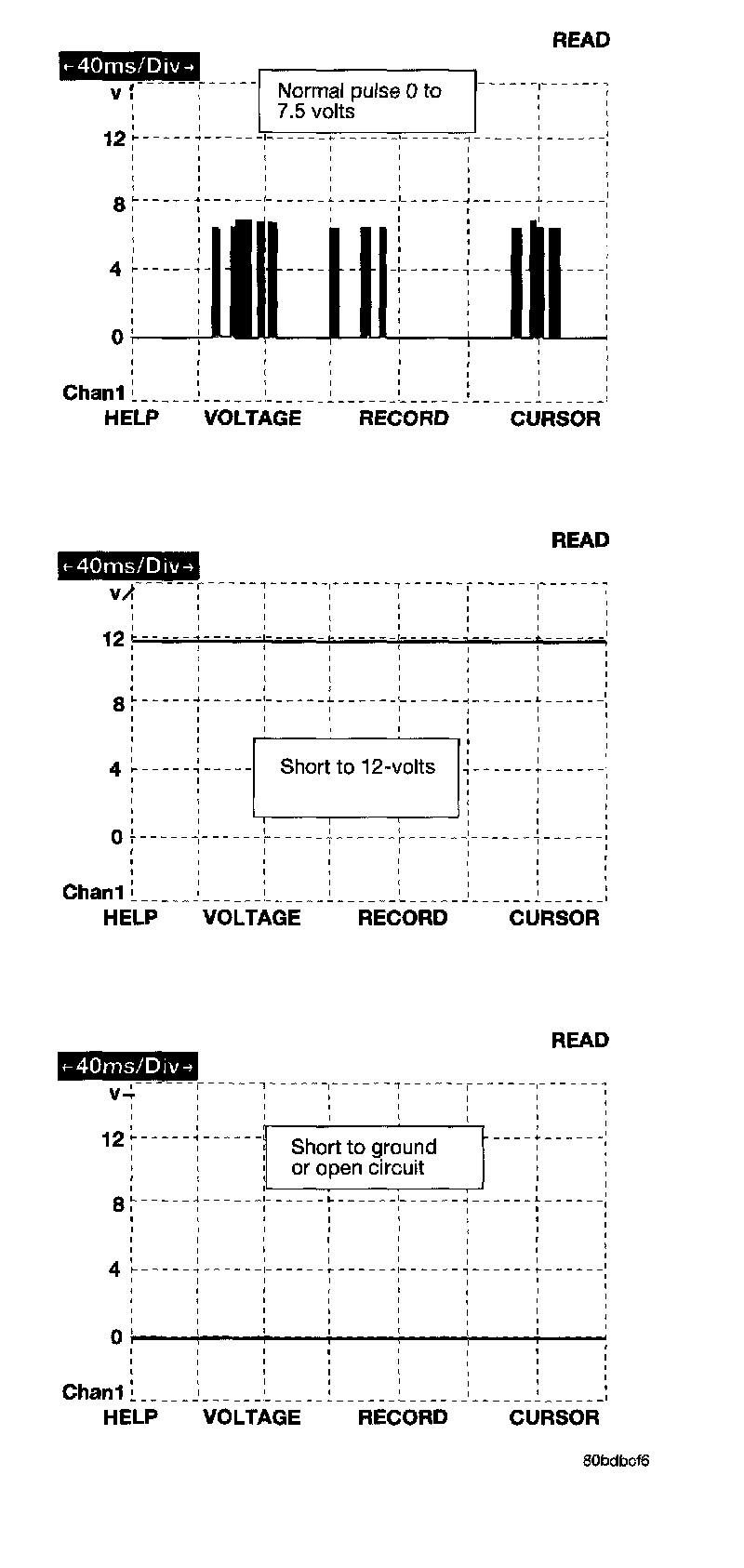 The bus messages are transmitted at a rate averaging 10800 bits per second. Since there is only voltage present when the modules transmit and the message length is only about 500 milliseconds, it is ineffective to try and measure the bus activity with a conventional voltmeter. The preferred method is to use DRBIII (R) lab scope. The 12V square wave selection on the 20-volt scale provides a good view of the bus activity. Voltage on the bus should pulse between zero and about seven and a half volts. Refer to the figure for some typical displays.