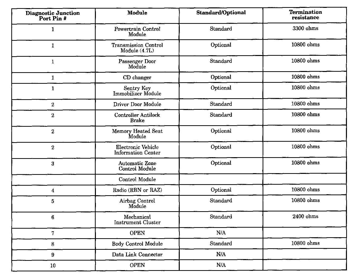 Diagnosis starts with symptom identification. If complete PCI Bus Communication Failure is suspected, begin by identifying which modules the vehicle is equipped with and then attempt to get a response from the modules with the DRBIII (R). If any modules are responding, the failure is not related to the total bus, but can be caused by one or more modules PCI circuit or power supply and ground circuits. The DRBIII (R) may display "BUS +/- SIGNAL OPEN" or "NO RESPONSE" to indicate a communication problem. These same messages will be displayed if the vehicle is not equipped with that particular module. The CCD error message is a default message used by the DRBIII (R) and in no way indicates whether or not the PCI bus is operational. The message is only an indication that a module is either not responding or the vehicle is not equipped. Refer to the application table for a list of standard and optional modules and their respective Diagnostic Junction Port pin assignments.