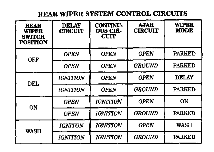 The third control circuit is the AJAR circuit. This circuit is fed by the flip-up glass ajar switch. When the flip-up glass is closed the ajar switch is open and the rear wiper module functions normally. When the flip-up glass is open, the ajar switch is closed and the circuit provides ground to the module. This ground signal indicates to the rear wiper module that it should park if operating or not allow operation if parked.