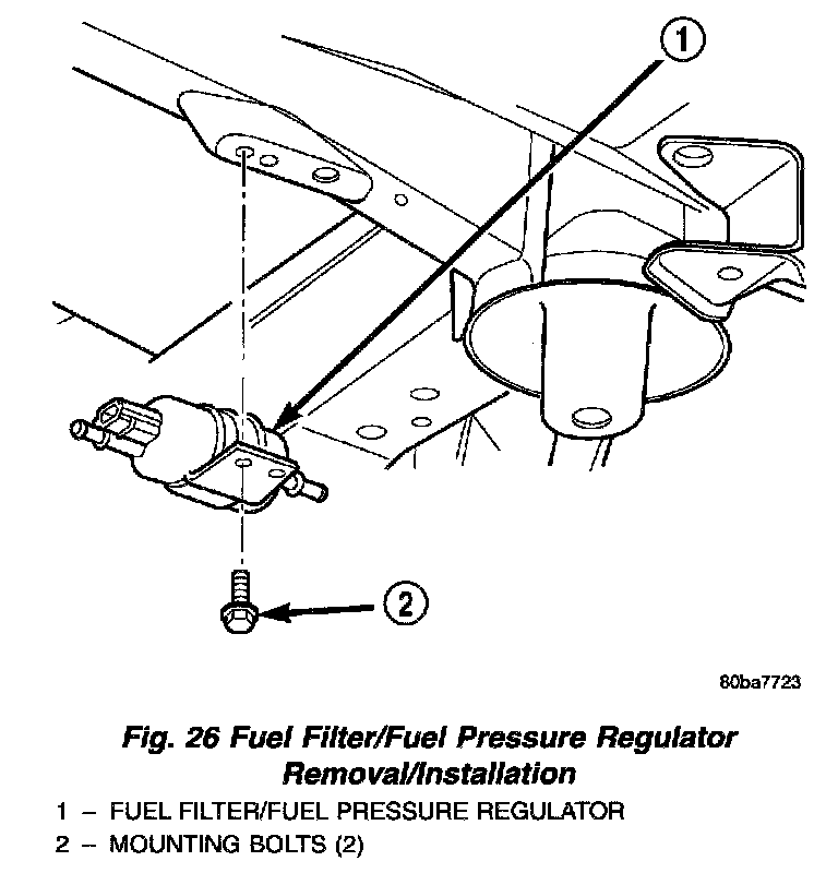 The combination Fuel Filter/Fuel Pressure Regulator is remotely mounted to the vehicle body, above the rear axle and near the front of the fuel tank (Fig. 25) or (Fig. 26).
