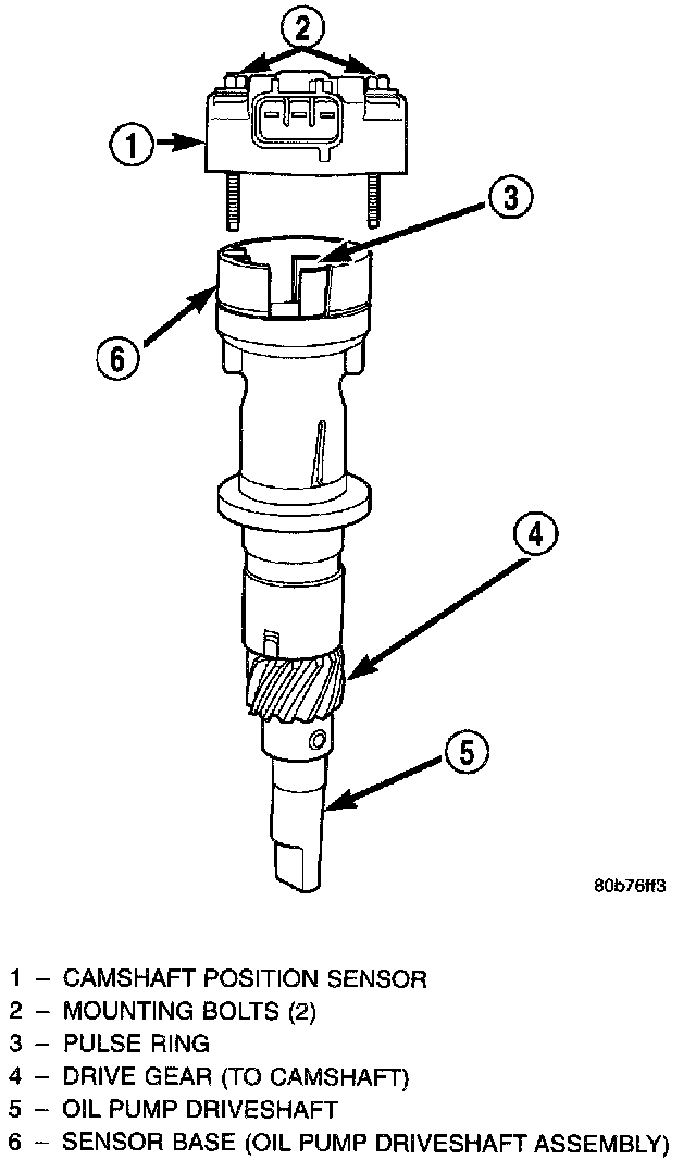 The Camshaft Position Sensor (CMP) on this engine is bolted to the top of the oil pump drive shaft assembly. The sensor and drive shaft assembly is located on the right side of the engine near the oil filter.