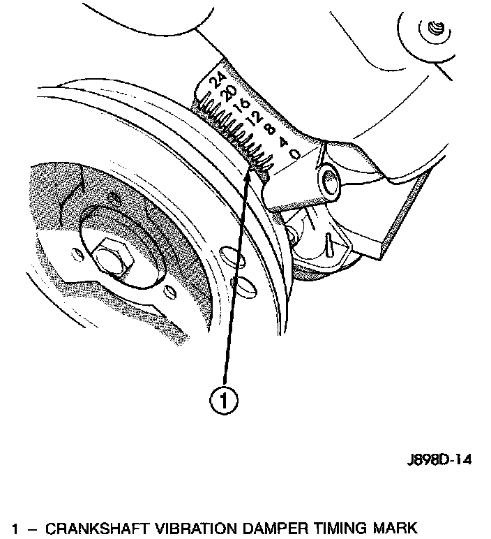 d. Slowly continue to rotate engine. Do this until timing index mark on vibration damper pulley aligns with top dead center (TDC) mark (0 degree) on timing degree scale. Always rotate engine in direction of normal rotation. Do not rotate engine backward to align timing marks.