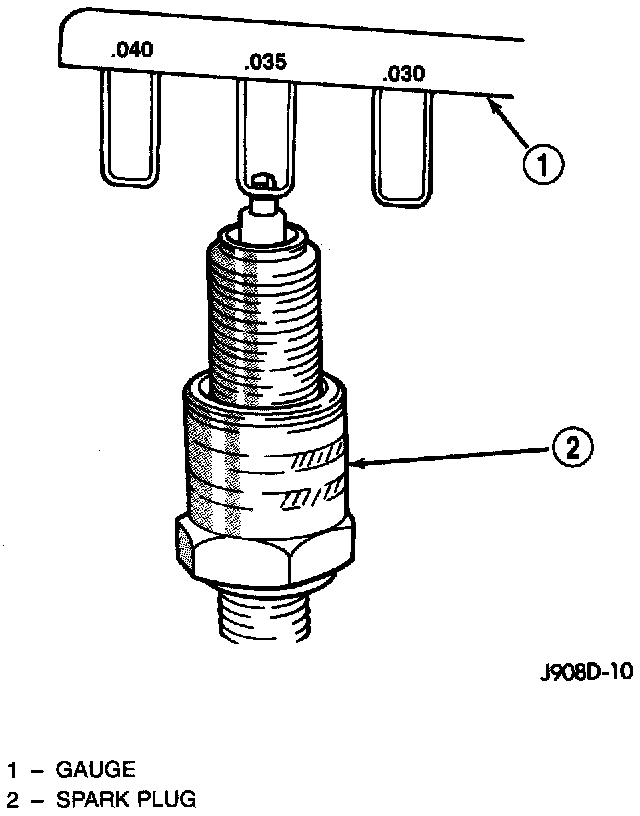 Check spark plug gap with a gap gauge tool. If the gap is not correct, adjust it by bending ground electrode. Never attempt to adjust gap by bending center electrode.