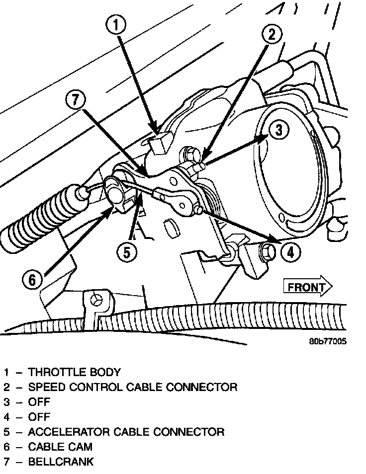 6. Using finger pressure only, disconnect speed control cable connector at throttle body bellcrank pin by pushing connector off bellcrank pin towards front of vehicle. DO NOT try to pull connector off perpendicular to the bellcrank pin. Connector will be broken.