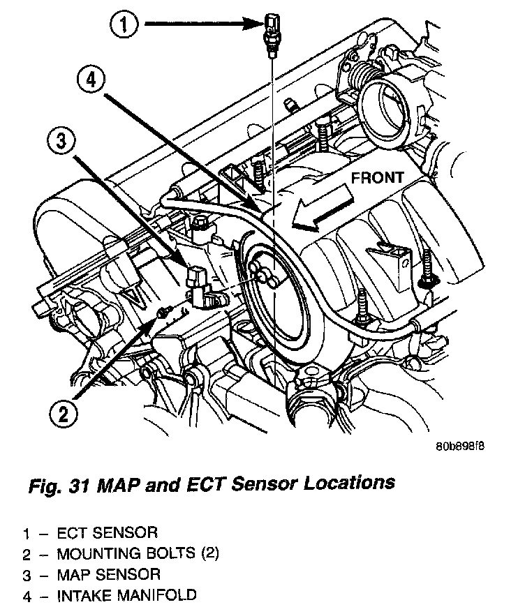 The MAP sensor is located on the front of the intake manifold . An O-ring seals the sensor to the intake manifold.