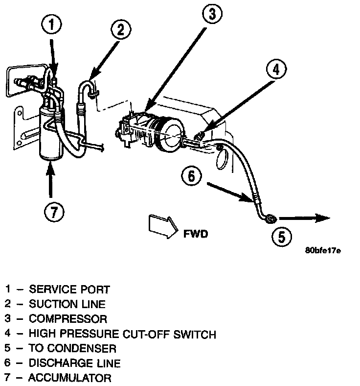 5. Remove the screws that secure the suction line and discharge line block fittings to the manifold on the compressor. Install plugs in, or tape over all of the opened refrigerant fittings.