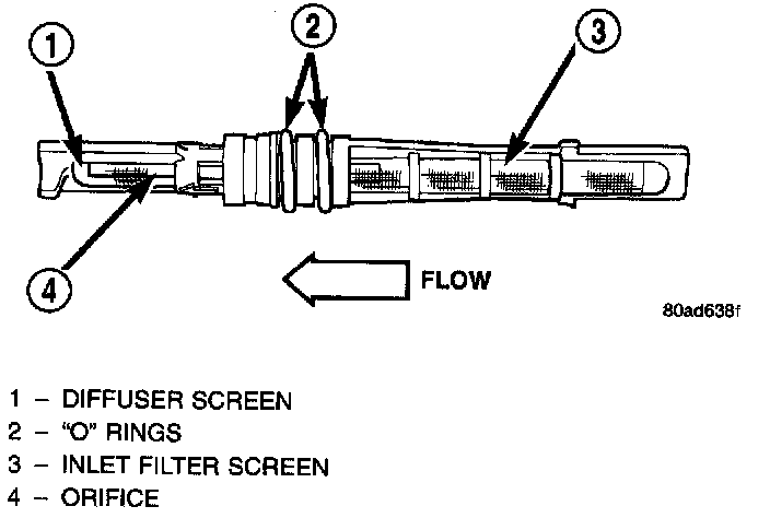 The inlet end of the fixed orifice tube has a nylon mesh filter screen, which filters the refrigerant and helps to reduce the potential for blockage of the metering orifice by refrigerant system contaminants. The outlet end of the tube has a nylon mesh diffuser screen. The O-rings on the plastic body of the fixed orifice tube seal the tube to the inside of the liquid line and prevent the refrigerant from bypassing the fixed metering orifice.