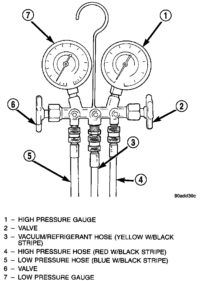 A manifold gauge set may be needed with some recovery/recycling/charging equipment. The service hoses on the gauge set being used should have manual (turn wheel), or automatic back-flow valves at the service port connector ends. This will prevent refrigerant from being released into the atmosphere.