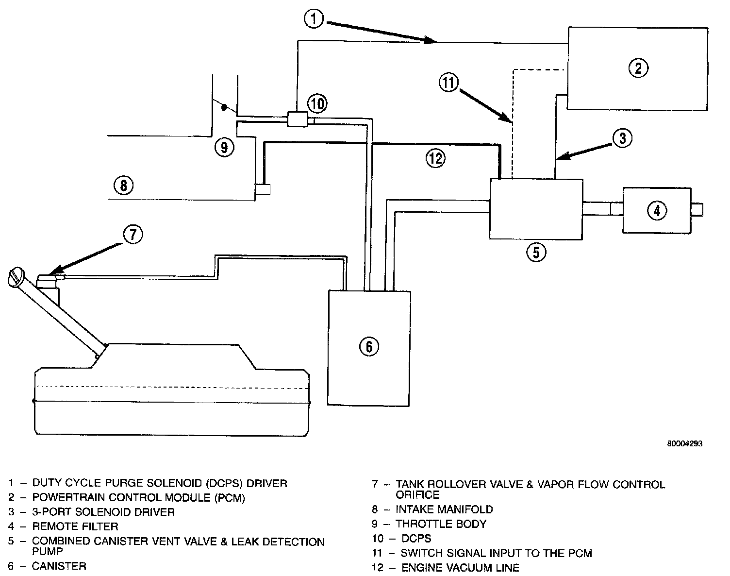 The duty cycle EVAP canister purge solenoid (DCP) regulates the rate of vapor flow from the EVAP canister to the intake manifold. The Powertrain Control Module (PCM) operates the solenoid.