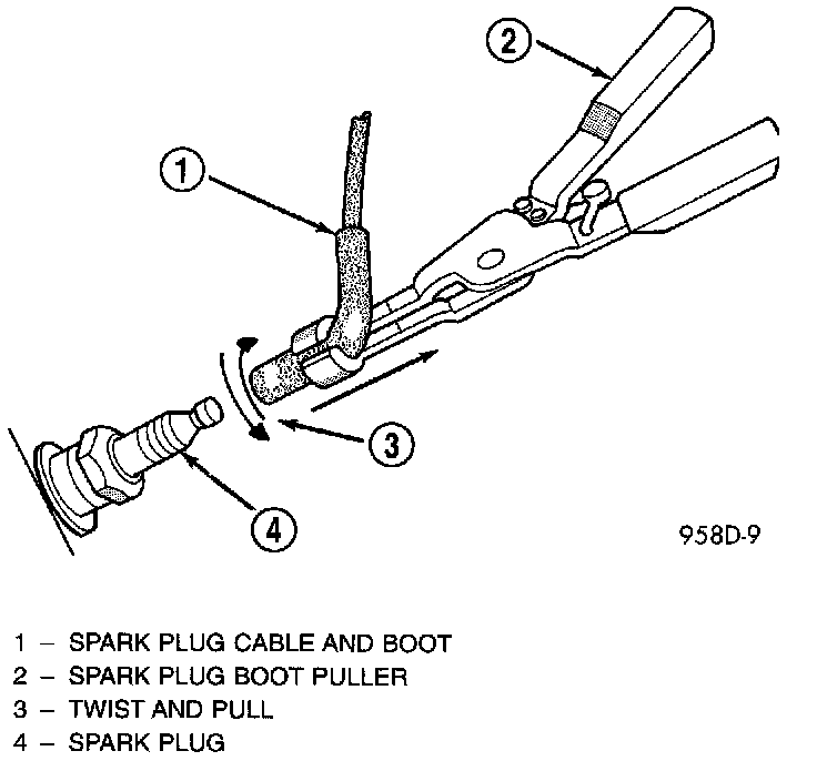 CAUTION: When disconnecting a high voltage cable from a spark plug or from the distributor cap, twist the rubber boot slightly (1/2 turn) to break it loose. Grasp the boot (not the cable) and pull it off with a steady, even force.
