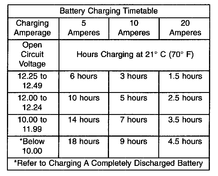 A battery charger that supplies only five amperes will require a longer charging time. A battery charger that supplies 20 amperes or more will require a shorter charging time.