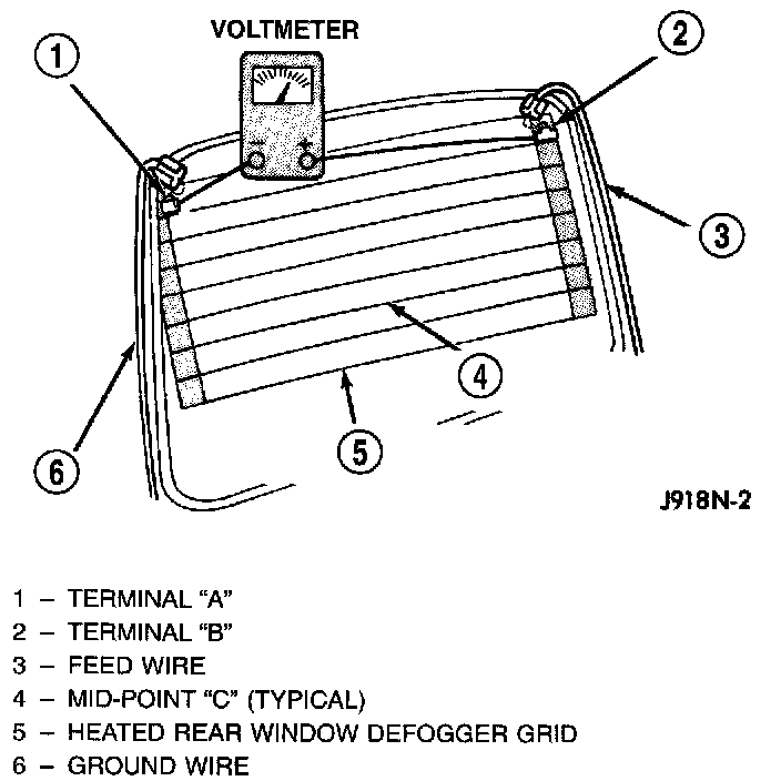 3. Using a 12-volt DC voltmeter, contact the rear glass heating grid terminal A (right side) with the negative lead, and terminal B (left side) with the positive lead. The voltmeter should read battery voltage.