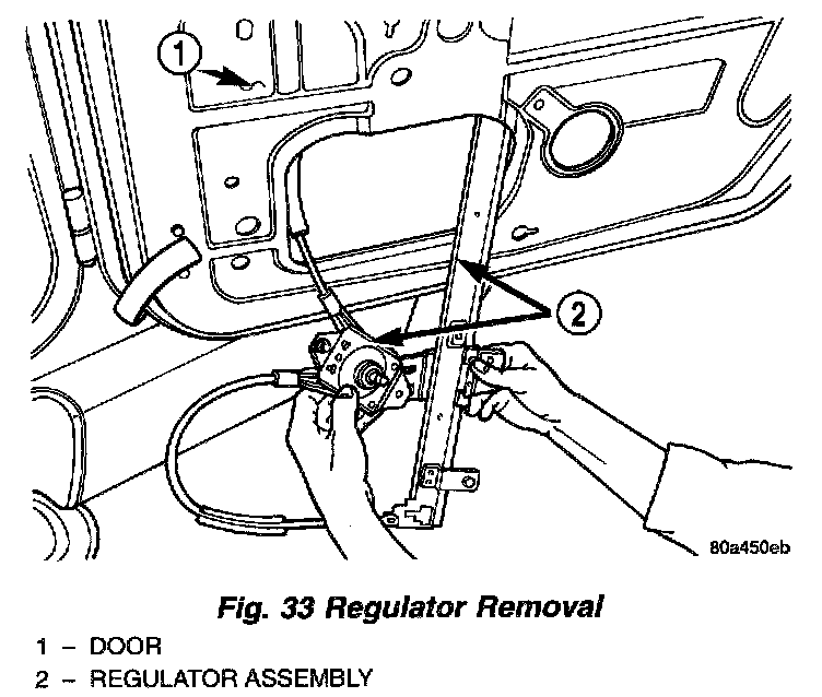 5. Lift the regulator upward to free it from the slotted holes in the door inner panel.