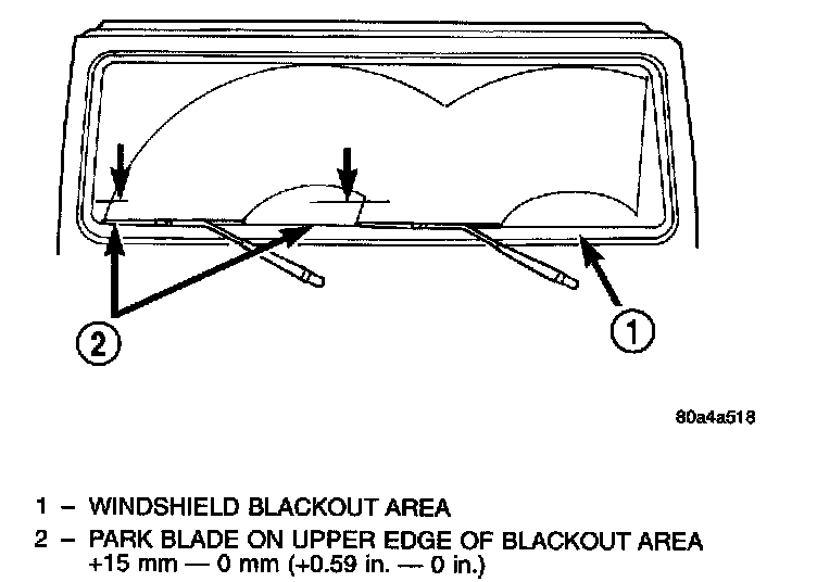 4. Mount the arms on the pivot shafts so that the tip of the wiper blade is on the upper edge of the lower windshield blackout area, + 15 mm/ - 0 mm (+ 0.59 in] - 0 in.).