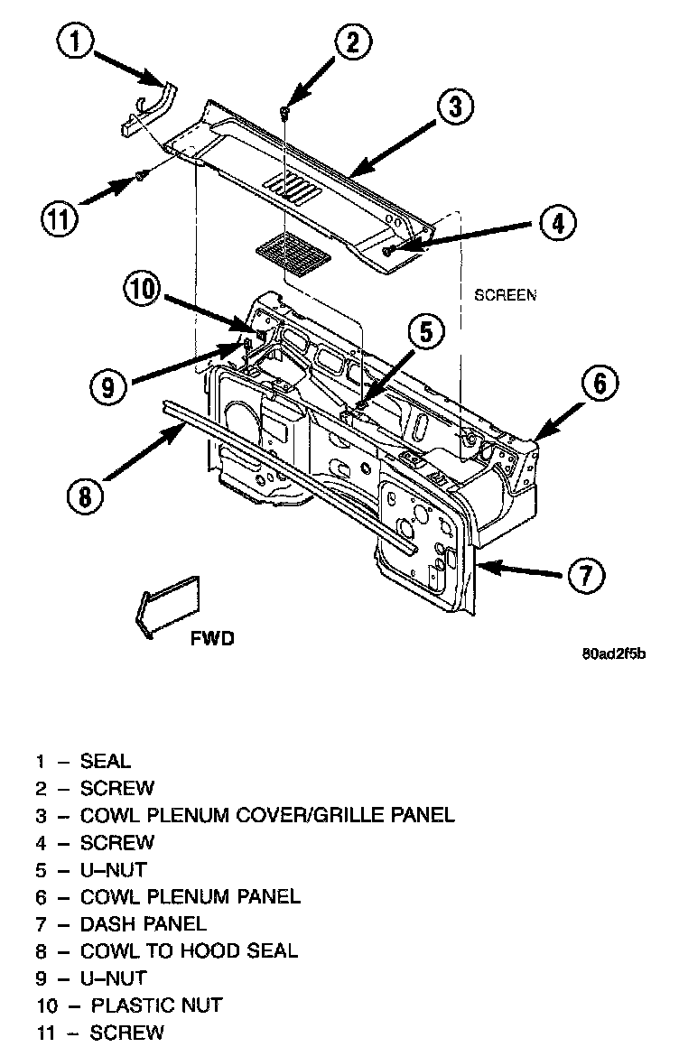 4. Remove the four screws that secure the cowl plenum cover/grille panel to the cowl panel near the base of the windshield.
