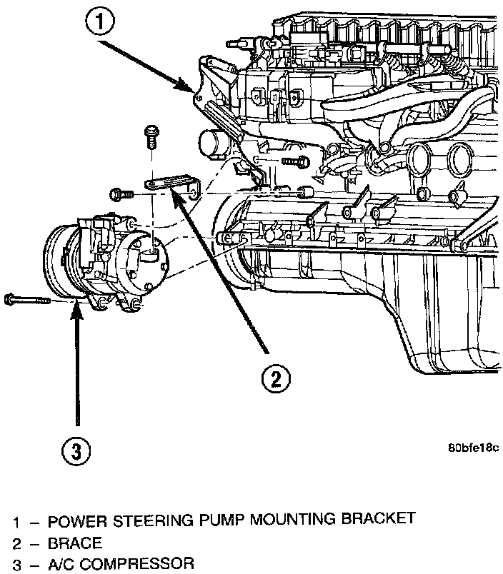 1. Tighten the mounting bolts fastening the compressor to the block to 45 - 65 Nm (35 - 50 ft. lbs.). Tighten the mounting bolts holding the rear brace to the compressor and block to 40 - 55 Nm (30 - 40 ft. lbs.).